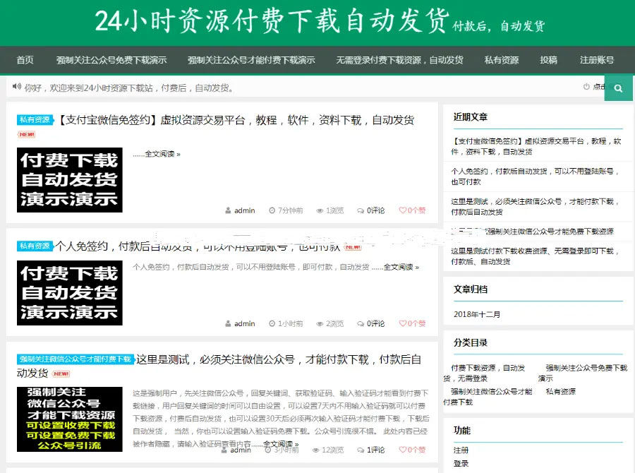 本源码适合网上出售虚拟资源,可以支持支付宝和微信支付,不用申请官方接口,免签约,只需注册一个账号即可,支持免登录下载,不需要什么有赞云,支持自动发货流程,付款后自动发货.支付平台自己记入订单时间