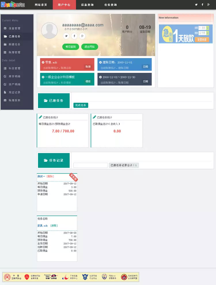 网站功能:发布记账任务。完成作务。收取佣金。账簿管理。凭证录入。科目管理。明细账管理。报表资产。损益。现金流量表。