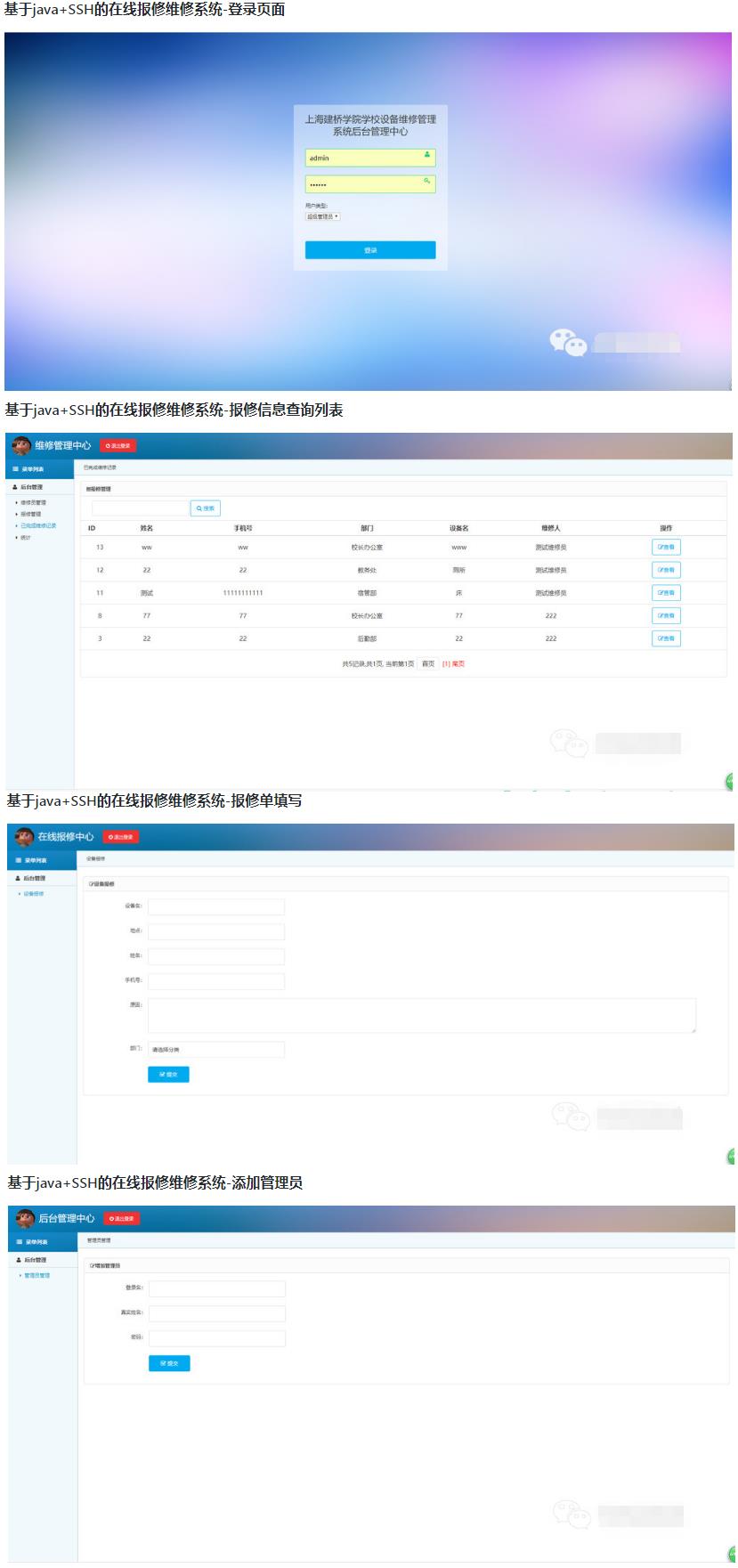 基于SSH技术(struts2,spring,hibernate)实现一个在线报修维修系统, 支持管理员, 维修人员, 普通用户这些角色, 每个角色动态具有相应的功能权限, 能够进行维修人员管理, 报修管理, 维修记录管理, 统计, 维修流程处理等功能, 该在线报修维修系统采用java技术进行开发