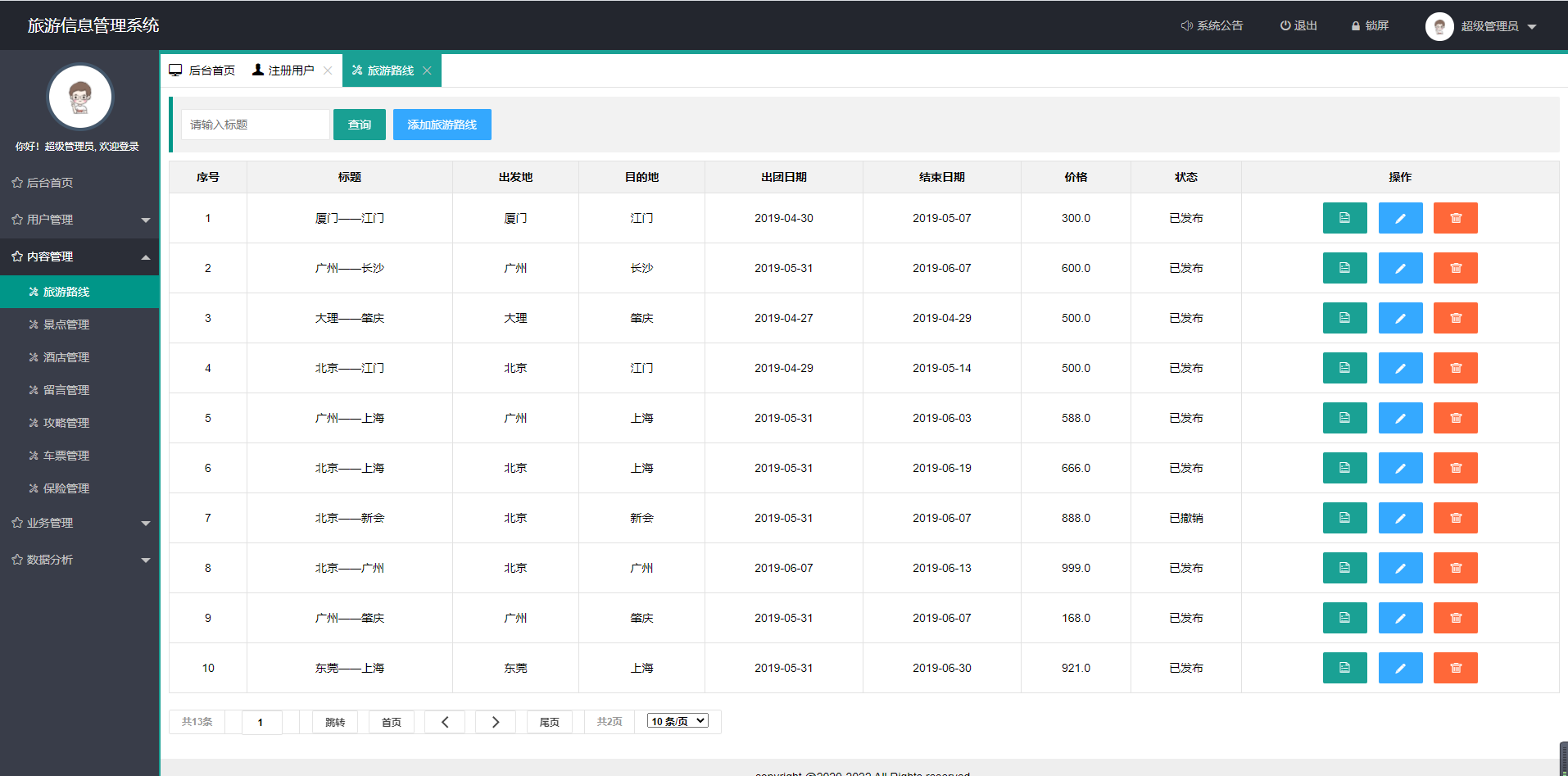 旅游路线、旅游景点、旅游酒店、旅游车票、旅游保险、旅游策略、订单管理、留言管理、数据分析等等。