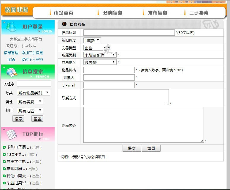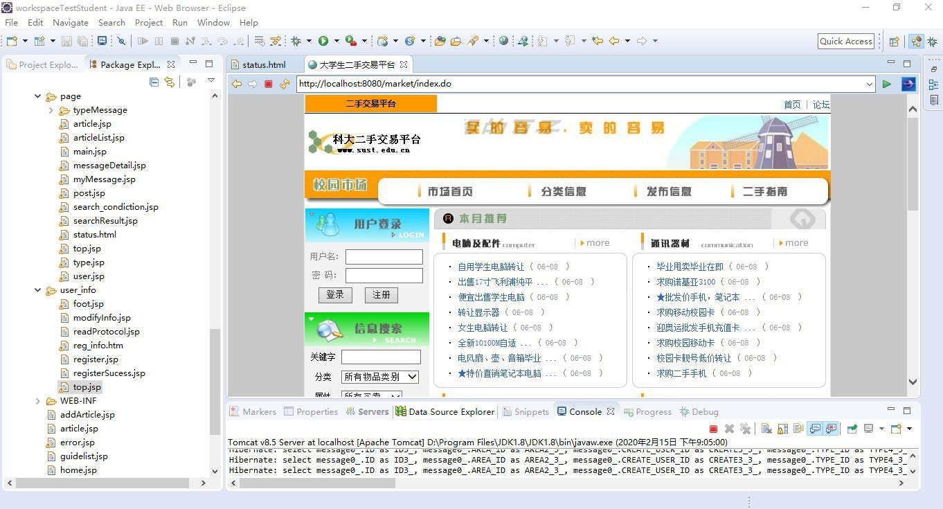 本系统采用JSP/servlet技术,是使用Java编程语言编写的一套校园网二手交易平台软件。系统采用的是最近几年流行的B/S开发模式。系统开发采用了实现MVC模式的Web应用组件:Struts,实现数据持久化功能的ORM组件:Hibernate,用JSP+HTML+JavaScript进行界面处理,数据库采用比较稳定的MySQL 5.0,并用JDBC进行数据库访问。