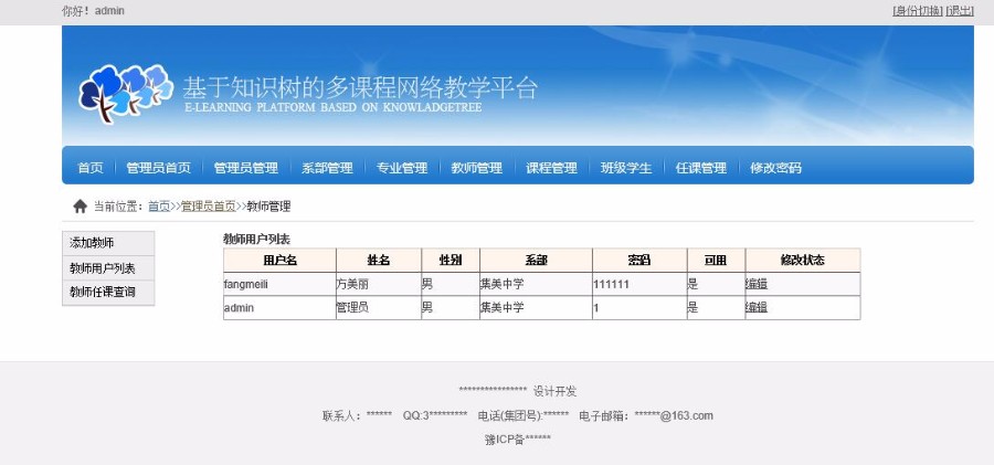 管理员用户负责对网站基础数据的管理,包括管理员管理、系部管理、专业管理、教师管理、