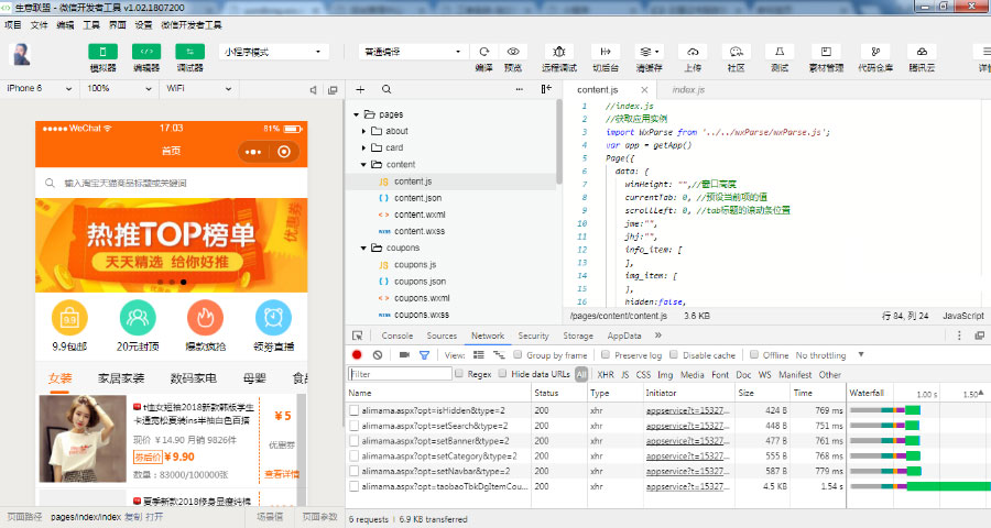 1、这是一个微信小程序对接某宝的某宝客api自助搜索优惠券领取程序,简单易学,适合学习