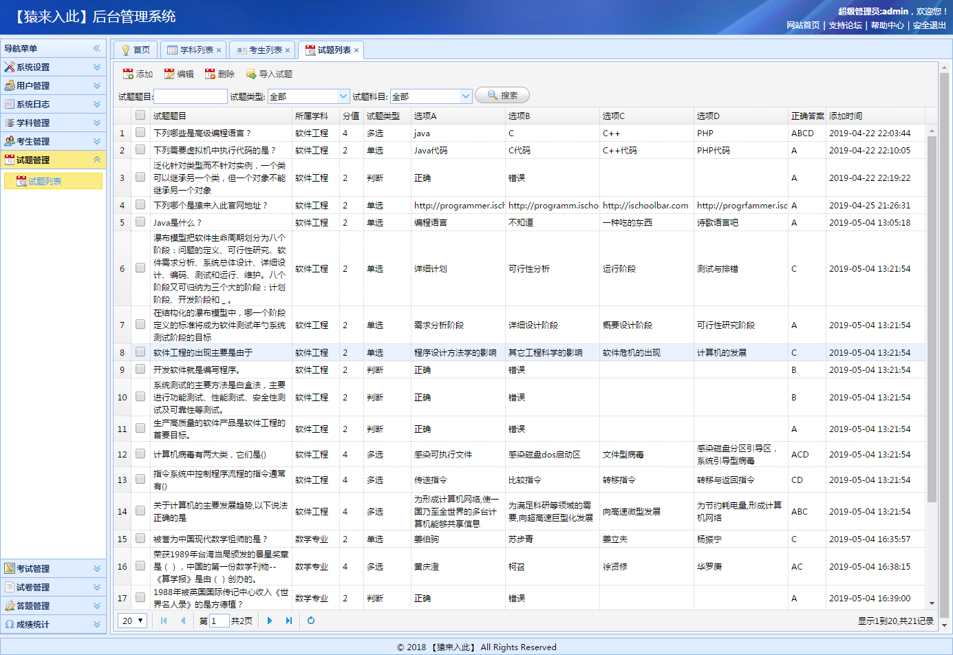 试题管理,及批量导入试题: