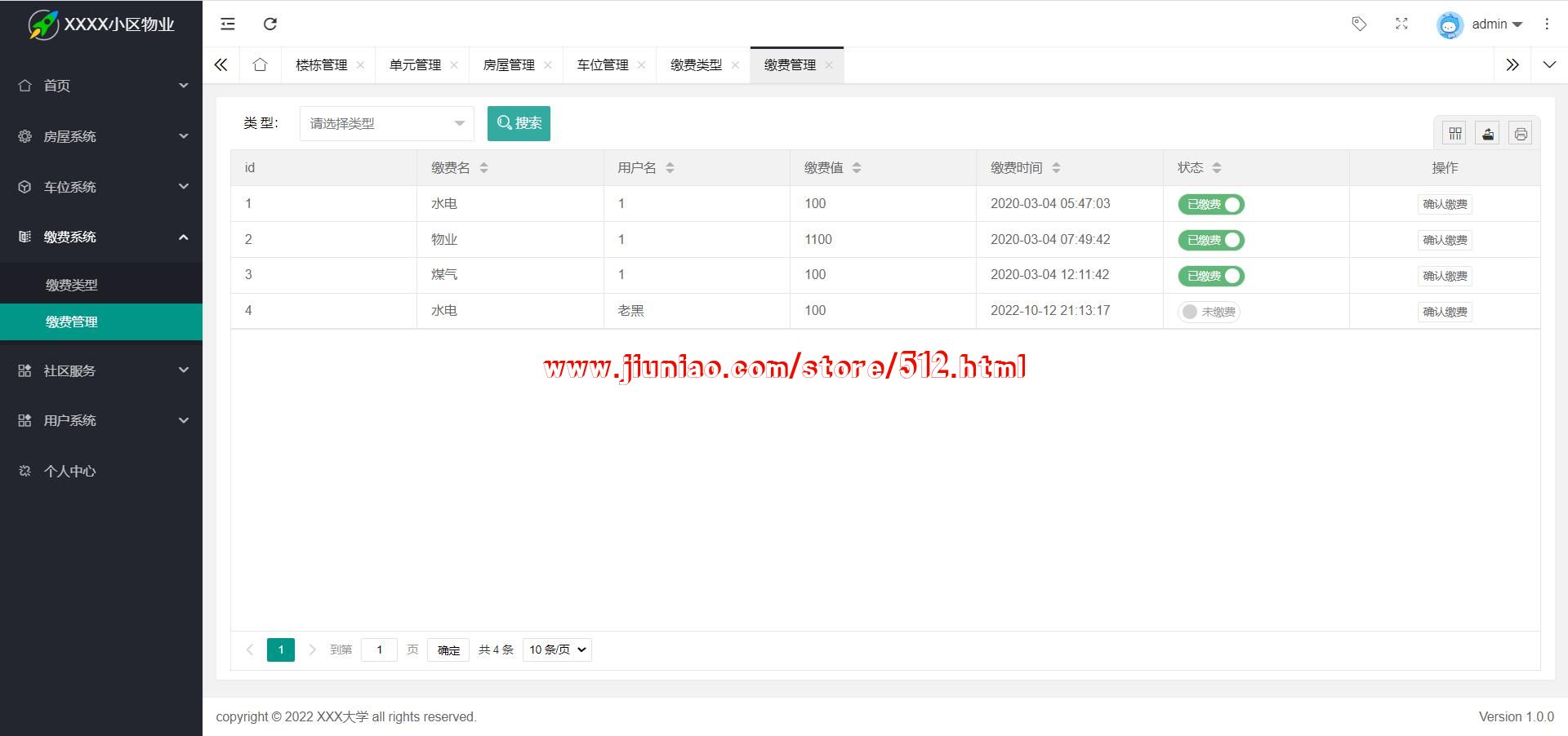 缴费管理(搜索缴费类型数据、确认缴费、导出数据)