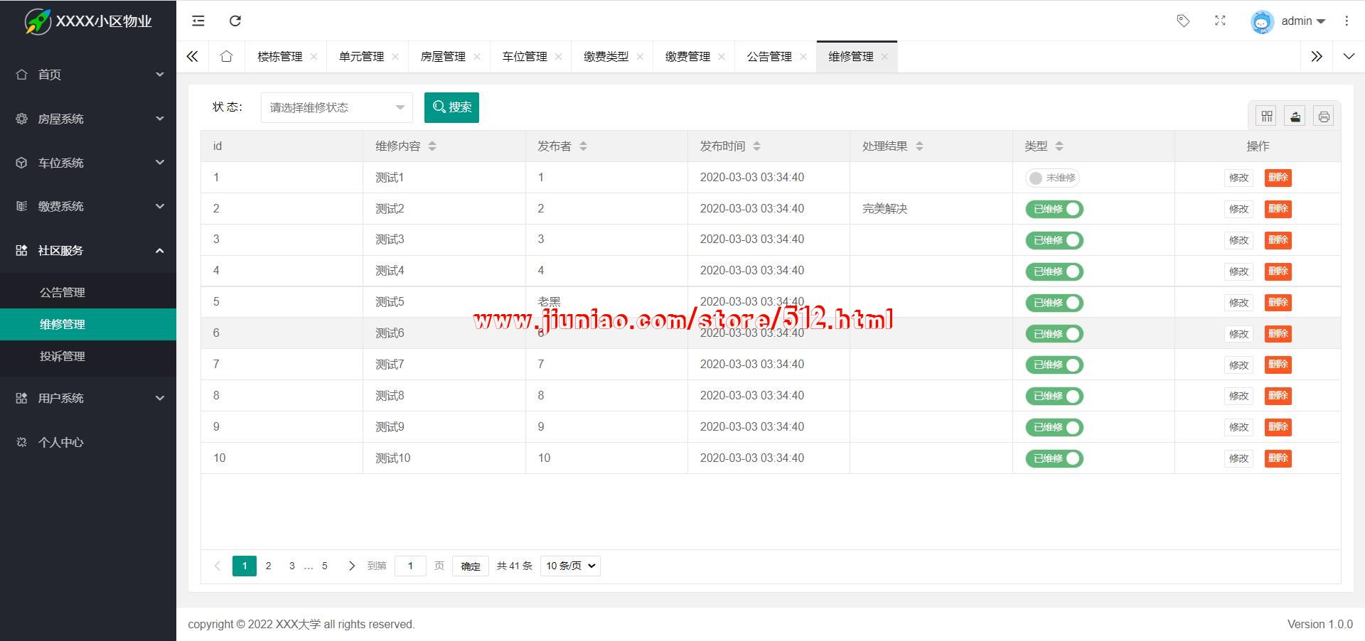 维修管理(搜索指定维修状态数据、修改楼栋、删除楼栋、导出数据)