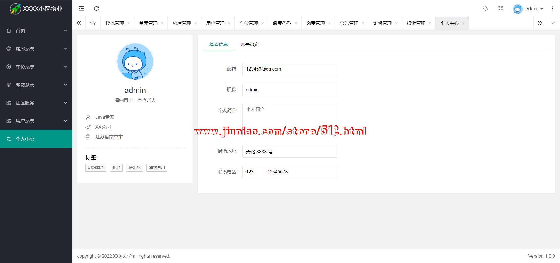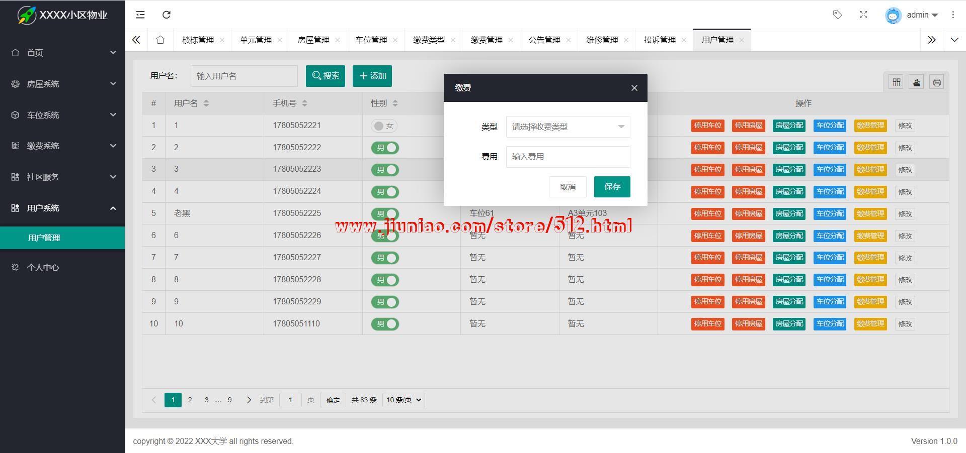 用户管理(添加用户、搜索指定用户、修改用户、停用车位、停用房屋、分配车位、分配房屋、缴费管理、导出数据)