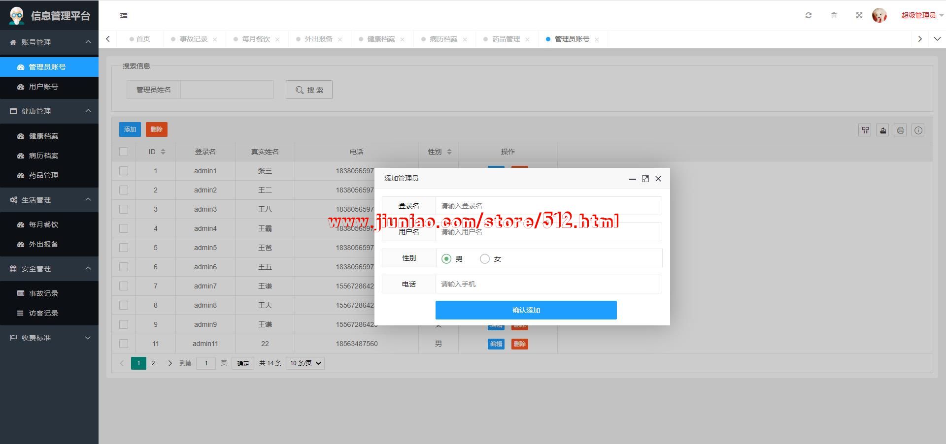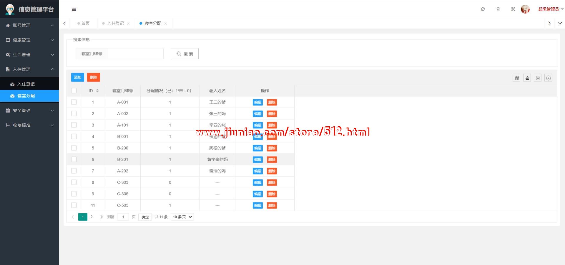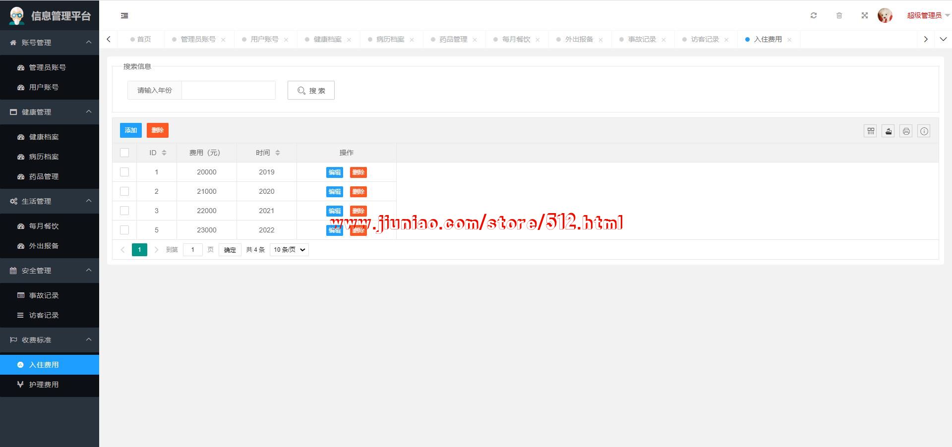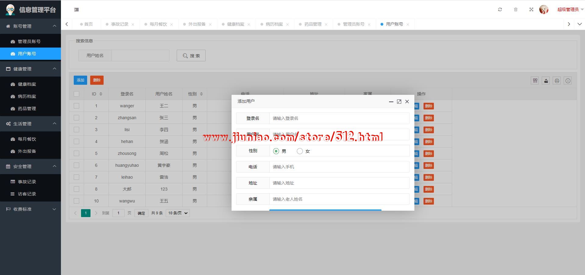 超级管理员:账号管理(管理员账号、用户账号)、健康管理(健康档案、病历档案、药品管理)、生活管理(每月餐饮、外出报备)、入住管理(入住登记、寝室分配)、安全管理(事故记录、访客记录)、收费标准(入住费用、护理费用)等;