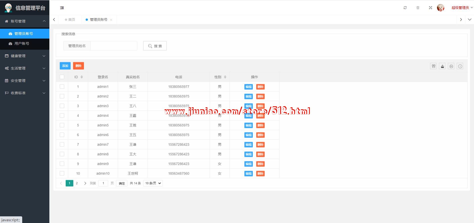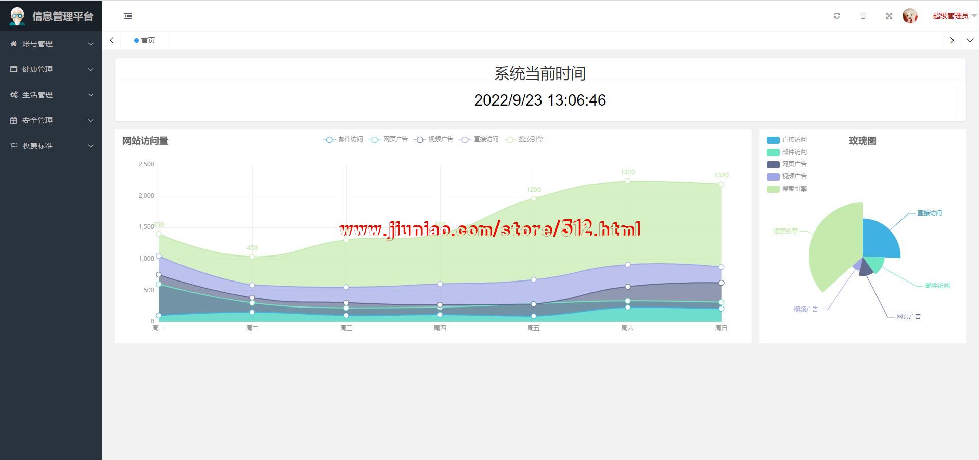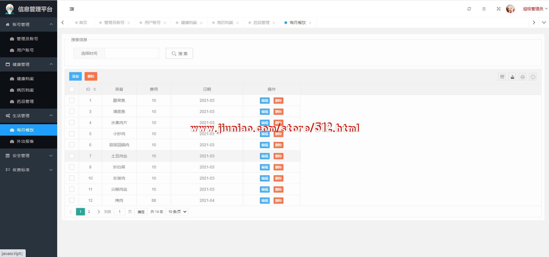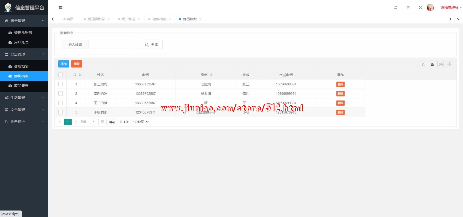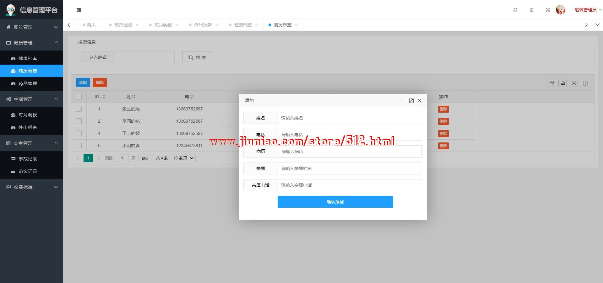 超级管理员:账号管理(管理员账号、用户账号)、健康管理(健康档案、病历档案、药品管理)、生活管理(每月餐饮、外出报备)、入住管理(入住登记、寝室分配)、安全管理(事故记录、访客记录)、收费标准(入住费用、护理费用)等;