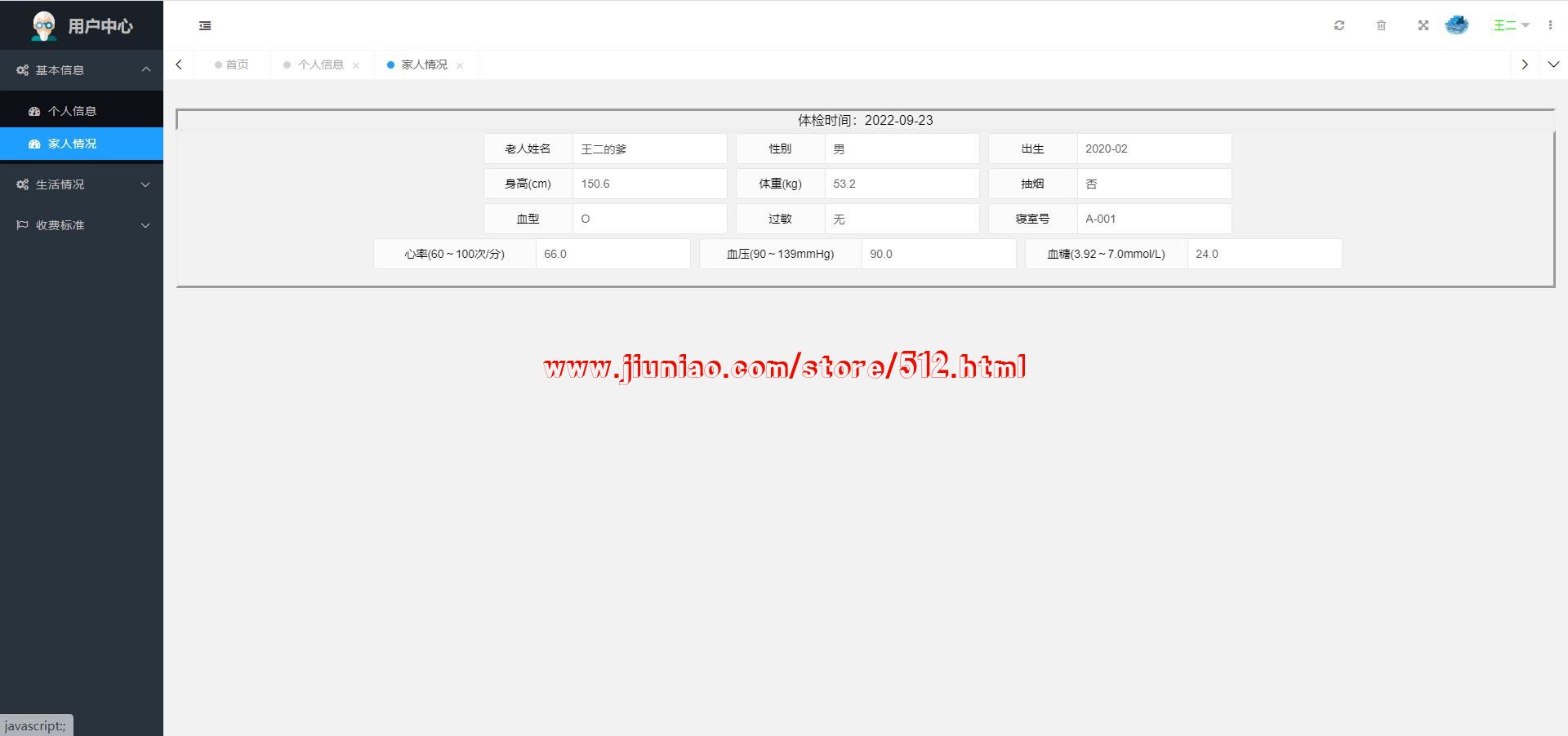 用户:基本信息(个人信息、家人情况)、生活情况(每月餐饮、外出报备)、收费标准(入住费用、护理费用)等;