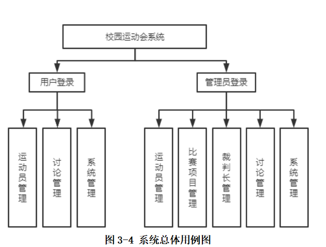 管理员-功能:进入系统后登陆账号进入系统页面。管理员主要功能如下(图3-2管理员用例图):运动员管理、比赛项目管理、裁判长管理、讨论管理、系统管理