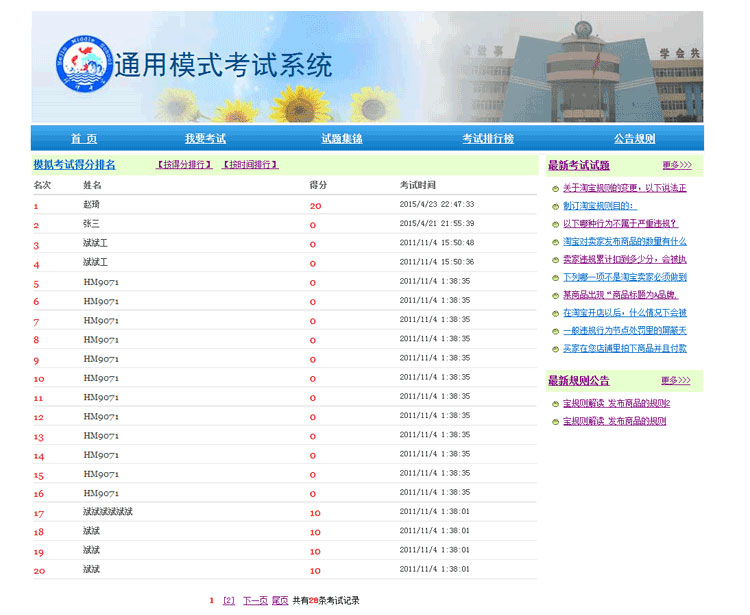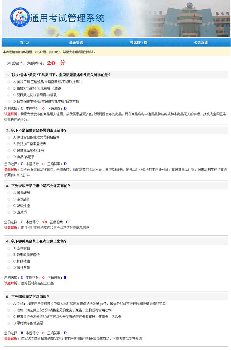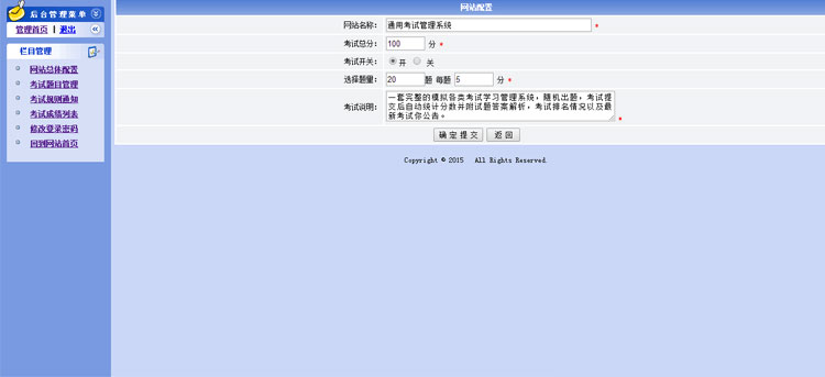 一套简单实用的模拟考试系统,后台出题无题目数量限制,前台考题解析,试题集锦,考试结果,考试公告发布等全部集在一起。前台每次随机无序出题。后台可自定义配置考试题目显示数量及每道题目的得分数。该程序还可应用于任何考试题目,只需要后台录入试题与答案及解析即可。