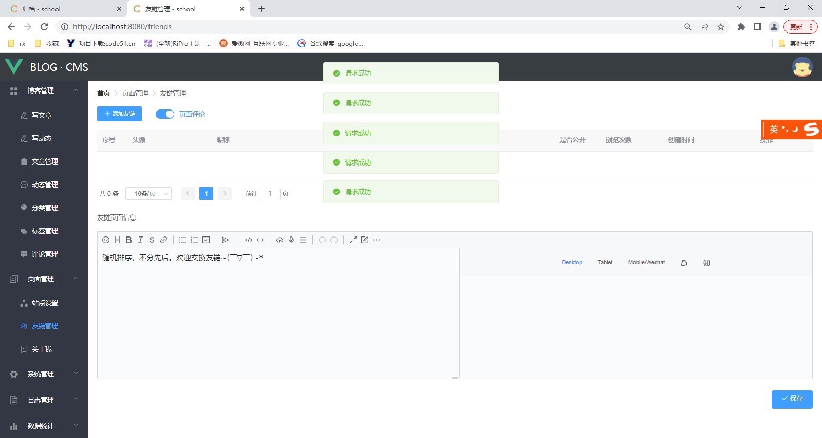 基于SSM+SpringBoot+Vue前后端分离博客论坛,管理员角色,整体功能包含前台博客信息展示,分类预览,归档内容,发布查看动态,关于我的内容,高级搜索,评论,回复评论,数据统计,写文章,发动态,文章管理,动态管理,分类管理,标签管理,评论管理,页面管理,日志查看,访客统计,站点设置,友链管理等。