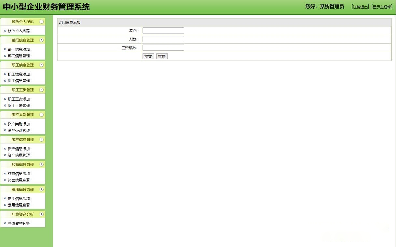 本设计主要分为职员和管理员两个角色,其中职员可以查看个人工资,公司资产,公司经营等信息;管理员则是可以管理部门,职员,资产,经营费用等信息。