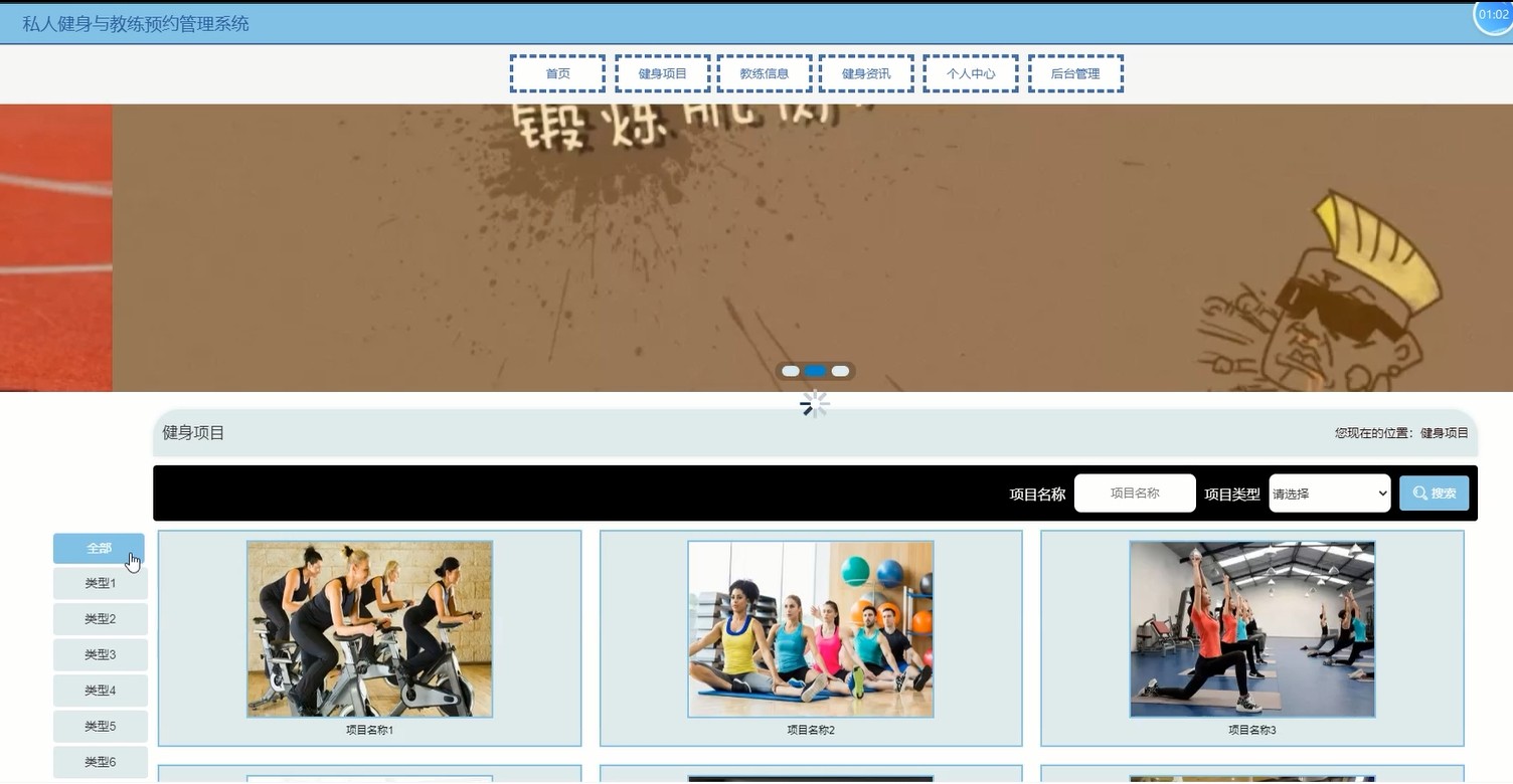 Java 框架:springboot JDK版本:JDK1.8 服务器:tomcat7 数据库:mysql 5.7(一定要5.7版本) 数据库工具:Navicat11 开发软件:eclipse/myeclipse/idea Maven包:Maven3.3.9 浏览器:谷歌浏览器 系统主要包括首页,个人中心,用户管理,教练管理,健身项目管理,项目分类,教练信息管理,教练预约管理,系统管理等功能模块。