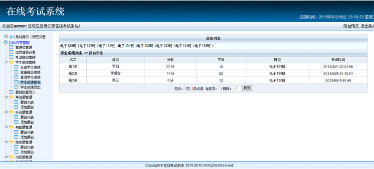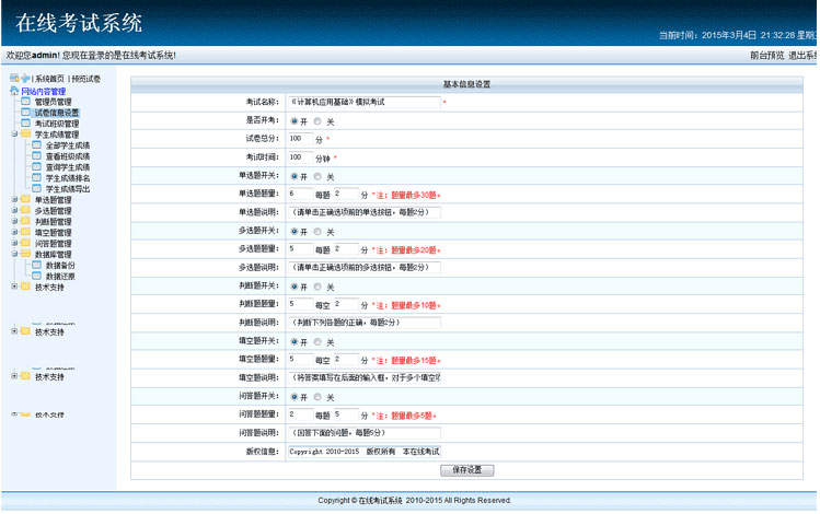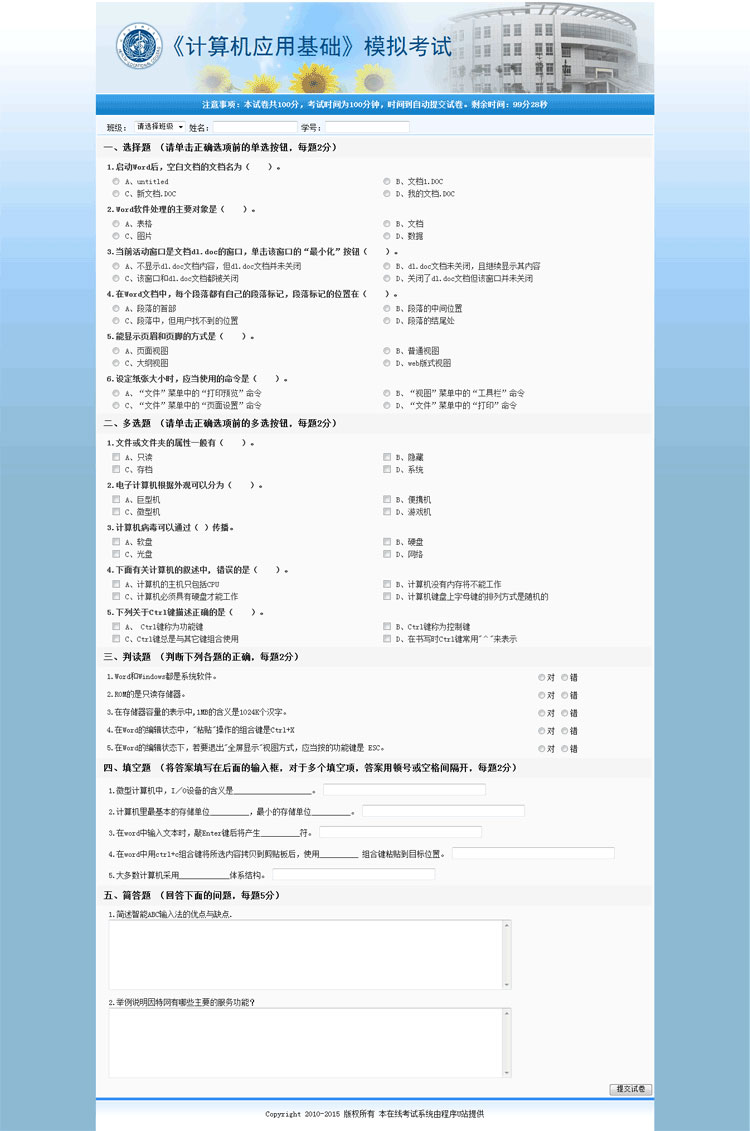 系统主要功能:1、设置基本考试系统信息(开通/关闭考试等)2、考试结束提交试卷,智能判断学生是否重复提交3、支持题型:选择题,判断题,填空题,问答题4、支持客观题自动阅卷,统计总分,并统计排名5、生成成绩分析排名报表和打印导出功能等