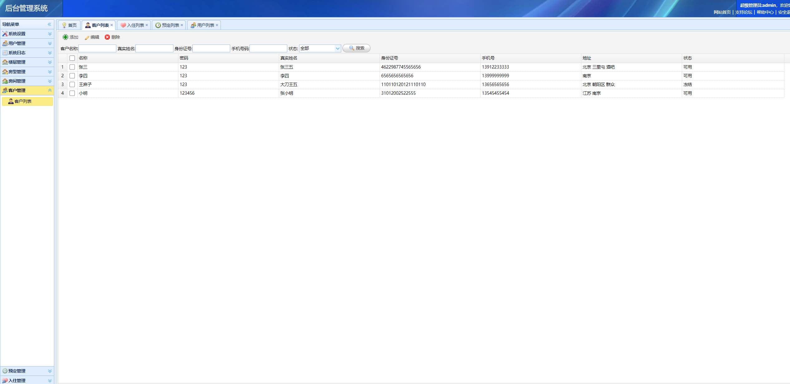 管理员登录以后可以对客户、用户信息、入住信息、房间类型、楼层、房间、预定信息、日志信息、营业信息进行管理,以及系统设置密码修改。