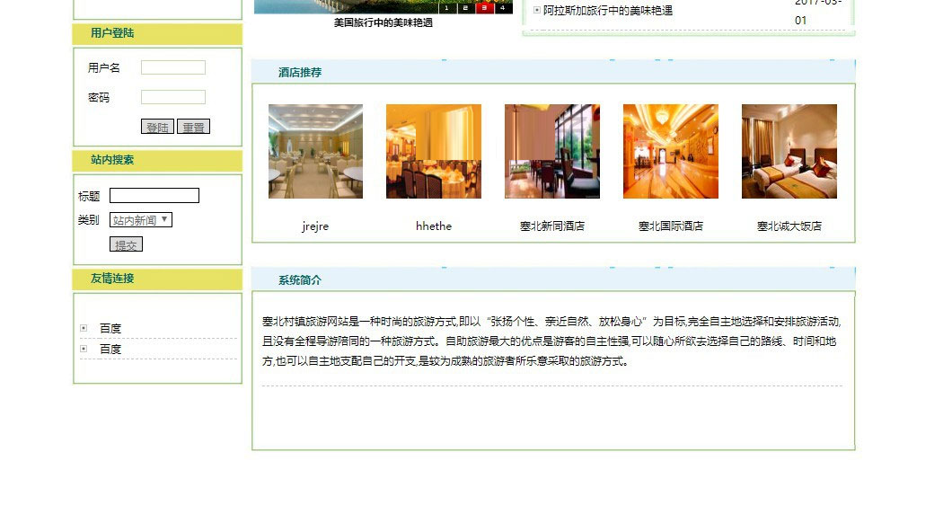 首页效果、首页塞北人文、首页酒店信息、首页景点信息、自驾游路线
