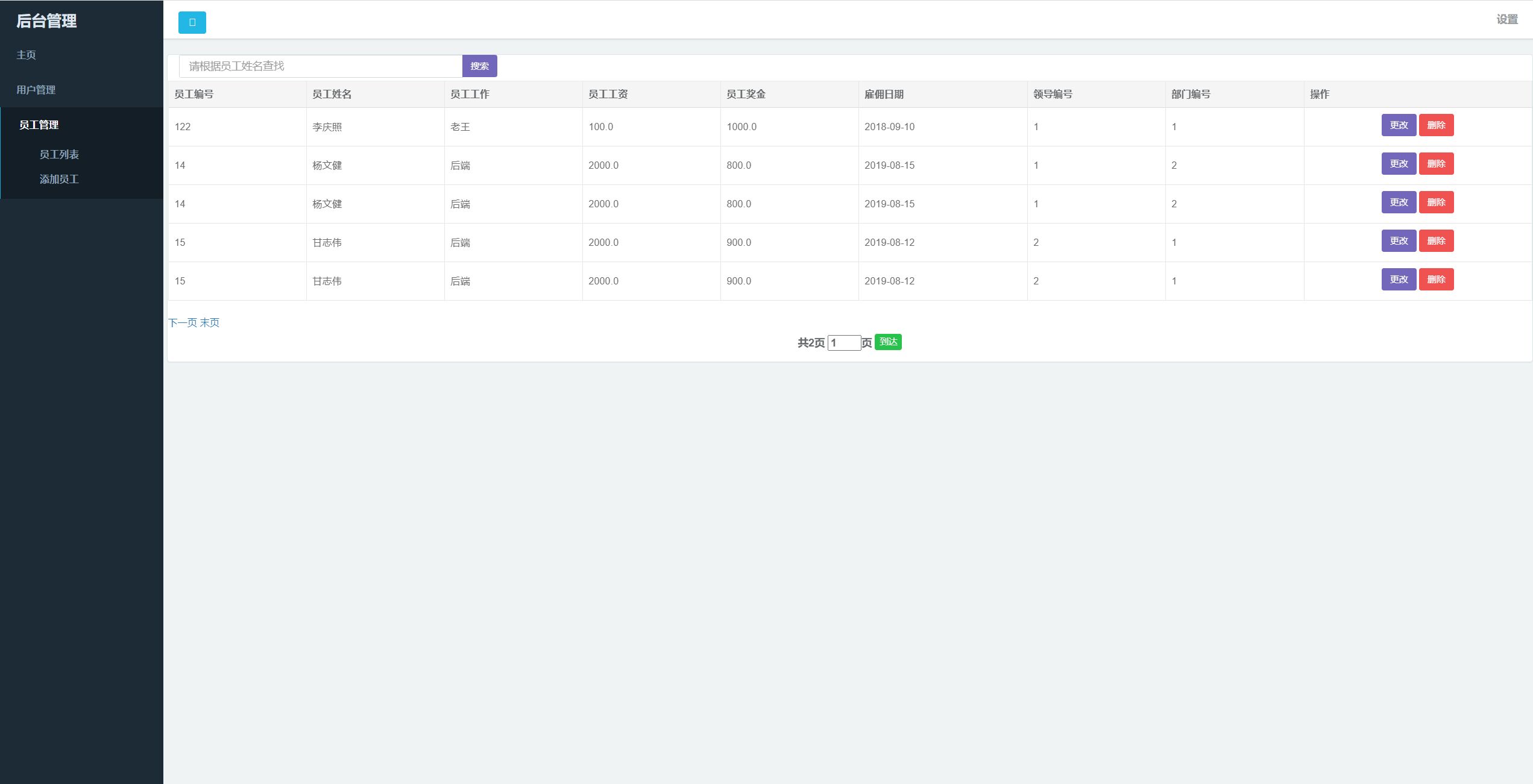 功能描述:本系统注册登陆以后,可以对用户信息的增删改查和员工信息模块的增删改查,以及数据统计的功能。