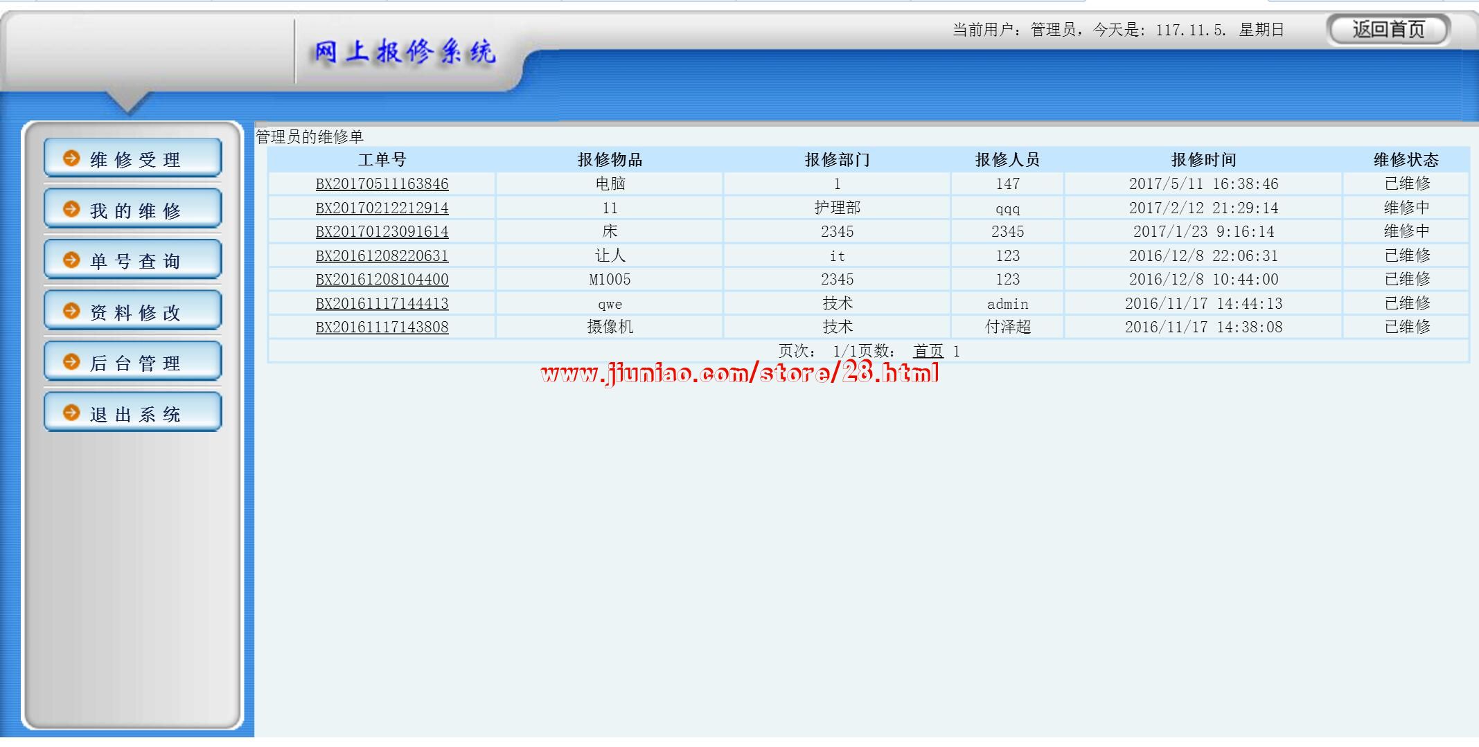 适用于各中小公司、学校和单位等内部的各类设备和资产报修,系统分为管理员、维修员和普通用户三级,普通用户填写报修和评价维修员,维修员查看和处理报修单,管理员后台管理用户和维修单。