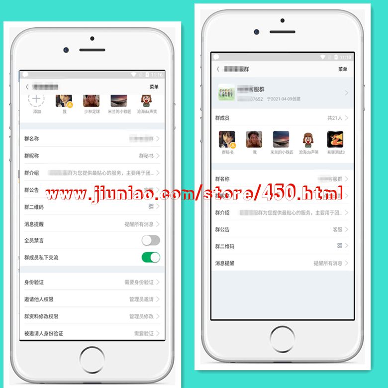 (2) 群管理:设定管理员,设定群成员身份,对群成员备注,群昵称,@标记显示,群邀请确认,踢出群组成员,群内搜索,允许显示群成员,允许普通成员私聊,邀请进群验证,解散/转让群聊等功能。