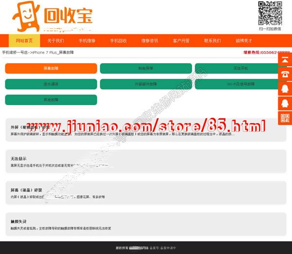 特点介绍:专为手机维修店开发的模板,让手机维修店快速建好自己的网站网站有手机回收估价系统,可以轻松估出二手机的价格维修系统可以根据不同的故障,给出相应的维修方案和相应的维修价格.可在线提交维修订单,用支付宝支付费用.采用css3技术,在div布局,打开快