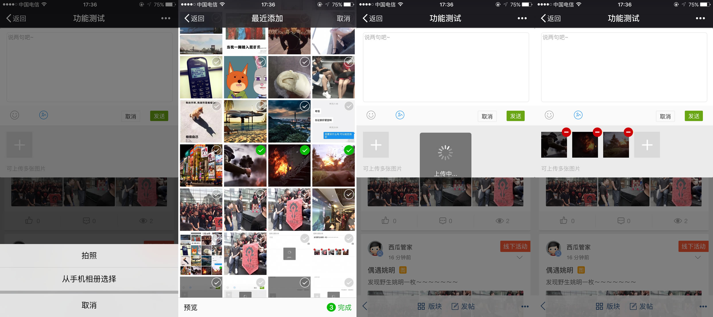 调用原生微信上传功能,上传体验很好。用手机 发帖、回帖、编辑帖子 时一次选择多张图片上传,无需一次次重复上传。支持西瓜手机版、支持兼容任何手机模版。新增的功能 让手机发帖、回帖、编辑等支持图文排版,在指定的位置插入图片。使用本插件需要有已认证的公众号(服务号、订阅号均可)。支持缩略图、支持水印等。