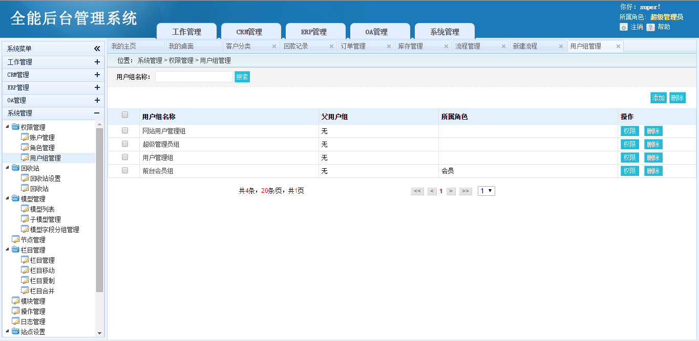 系统管理: 权限管理 账号管理 角色管理 回收站 模型列表 子模型管理 模型字段分组管理 节点管理 栏目管理 栏目移动 栏目复制 栏目合并 模块管理 操作管理 日志管理 站点信息 站点参数 邮件参数设置