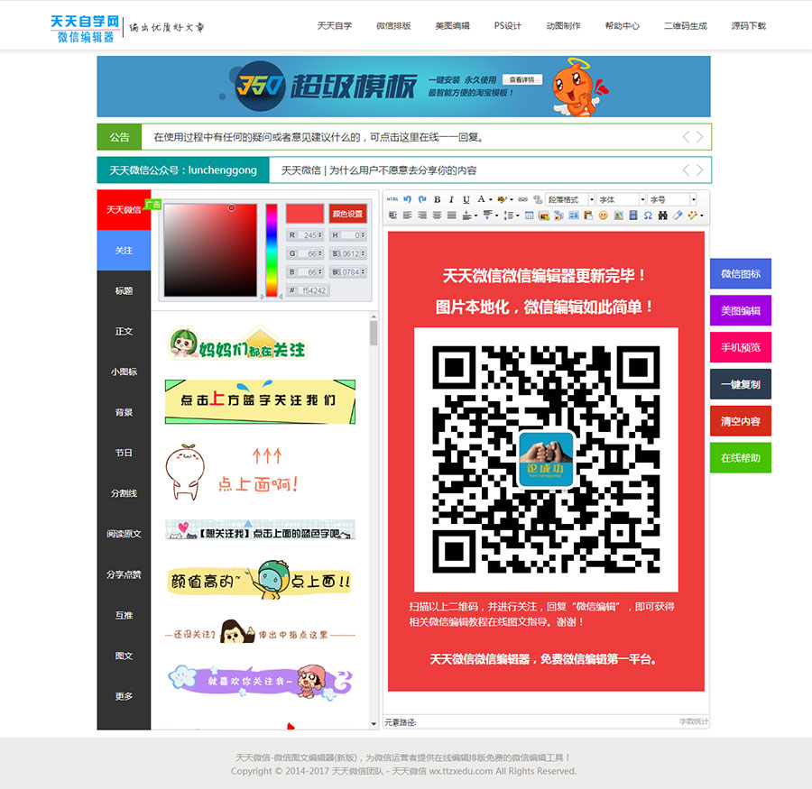 简介:很多人在使用微信发布消息和文章时,感觉微信的编辑器非常不好用,不好排版。所以网上应运而生了一些微信图文编辑器的网站,非常实用。上传安装:工具安装环境:PHP不需要数据库 无后台版本 支持二级目录上传的时候直接将所有文件上传到根目录或者二级目录,再用域名直接打开就可以了,免安装的。