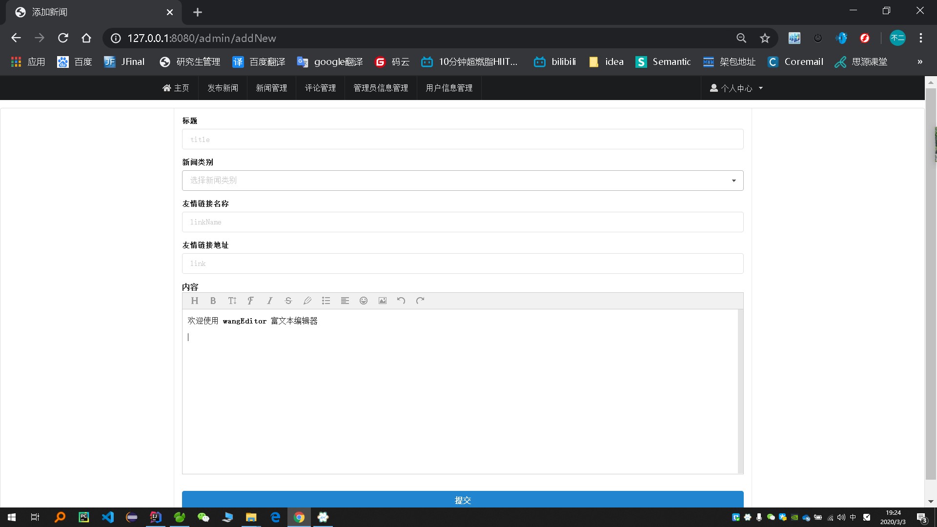 2)管理员在登录后可对新闻进行增删改查等维护操作、以及对用户进行合法性行为进行检查,包括用户对新闻的评论审核、用户的帐号的合法性,收藏用户的行为日志(后期可对用户兴趣进行计算)、对友情链接的维护与更新。