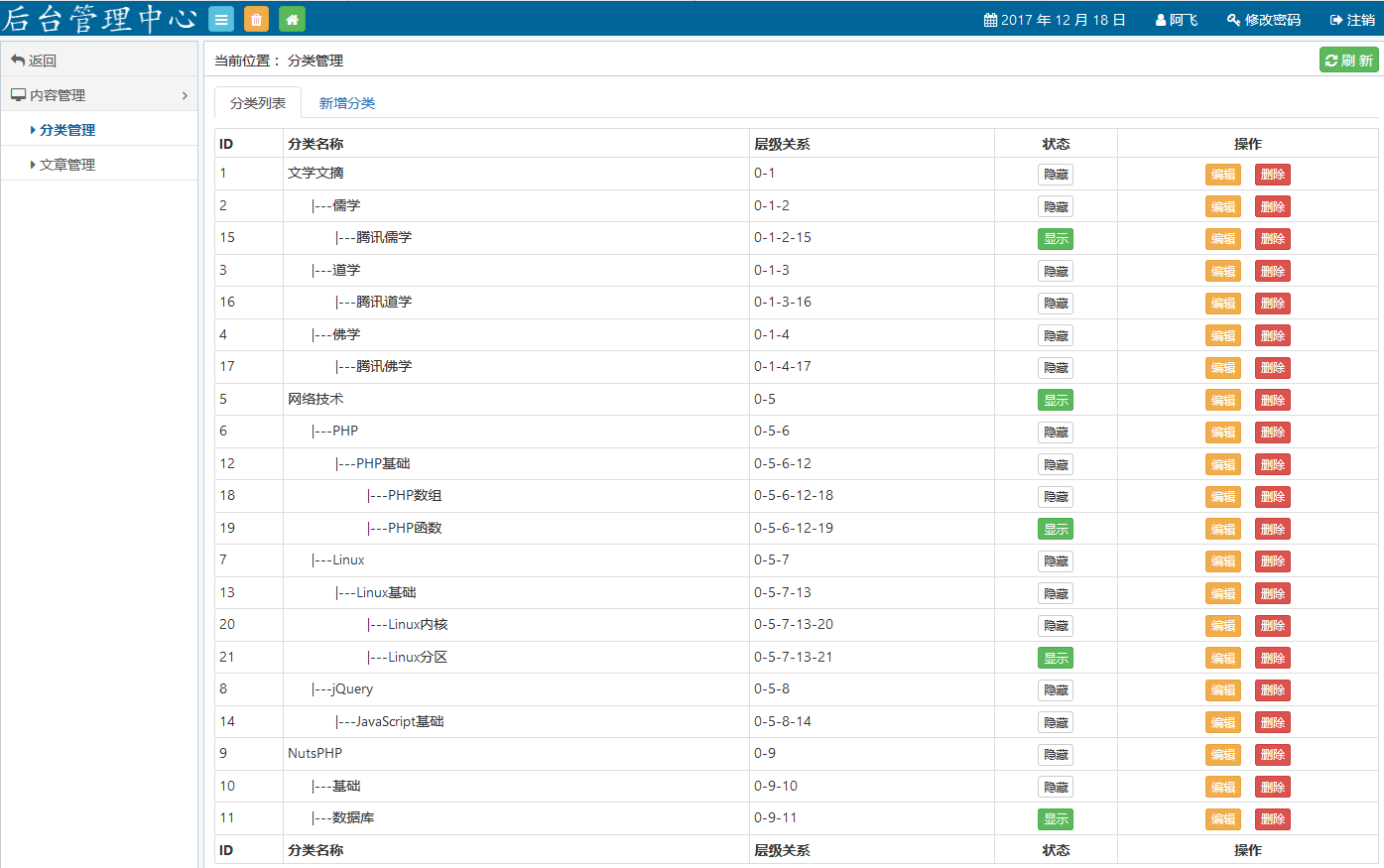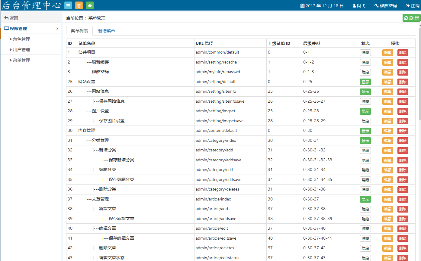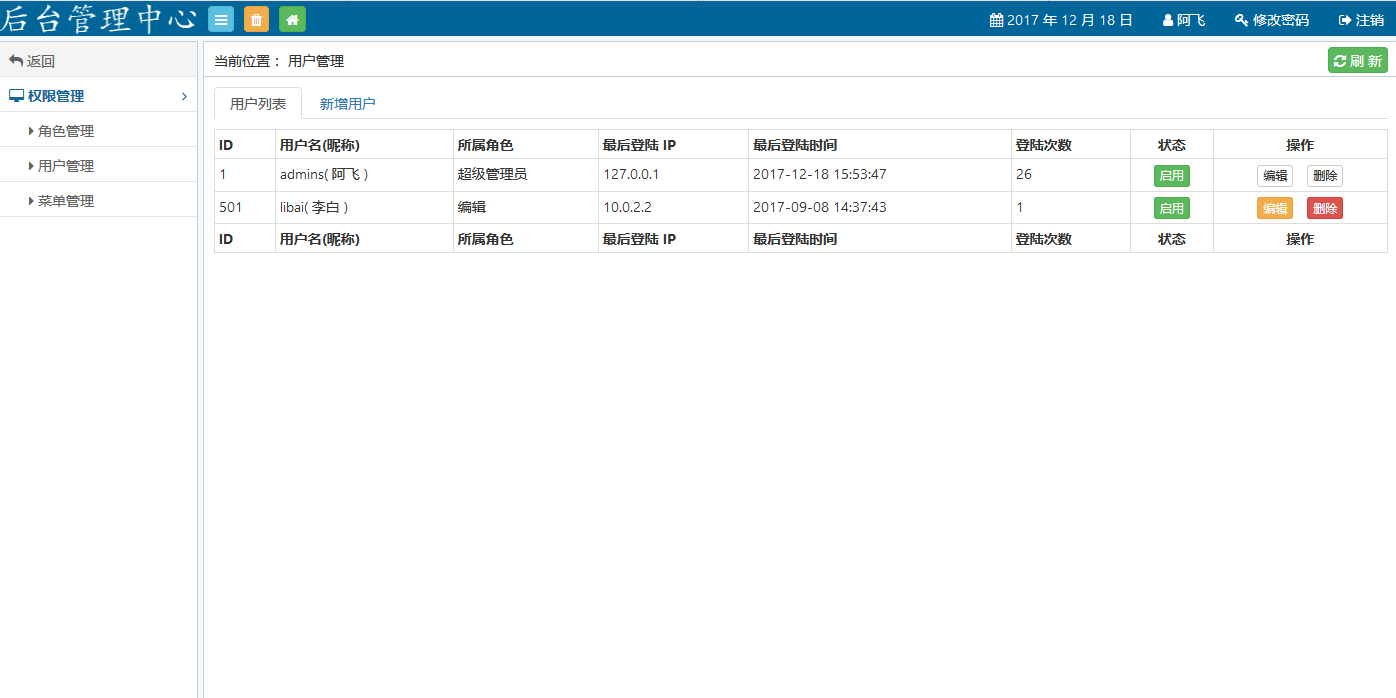 模块有管理员用户管理、后台菜单管理、角色管理、rbac 权限管理、分类管理、文章管理、幻灯片分类、幻灯片管理。基本模型使用,ueditor引入,layer、laypage、laydate的使用,webuploader 上传图片,远程下载图片等等
