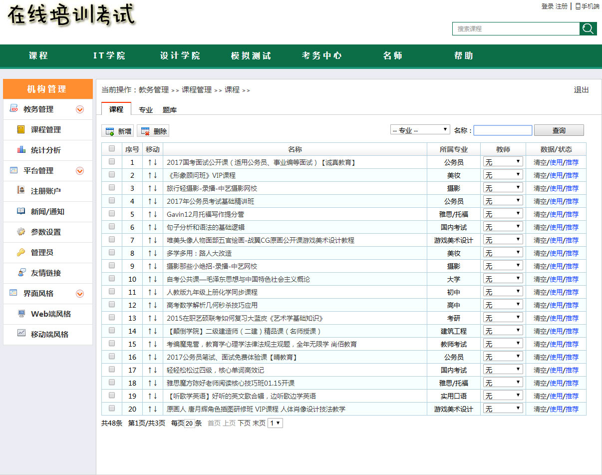 模拟考试:每个课程可以发布一些单元试卷,模拟试卷供学员平时自主练习,教师后台可以查看学员的成绩。