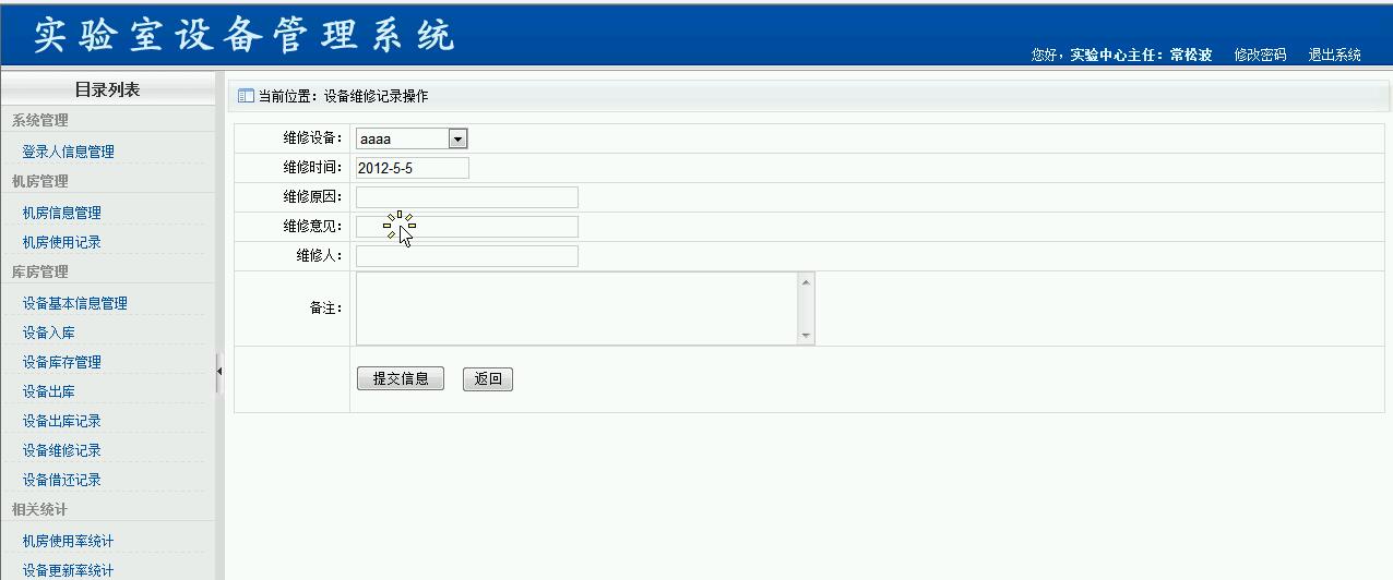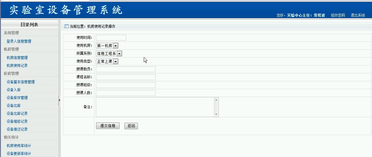 实验中心主任:人事资料管理机房信息管理机房使用记录设备基本信息管理设备入库设备库存管理设备出库设备出库记录设备维修记录设备借还记录机房使用率统计设备更新率统计实验室管理员:机房使用记录设备基本信息管理设备入库设备库存管理设备出库设备出库记录设备维修记录设备借还记录机房使用率统计设备更新率统计设备维修记录查询设备报废记录查询