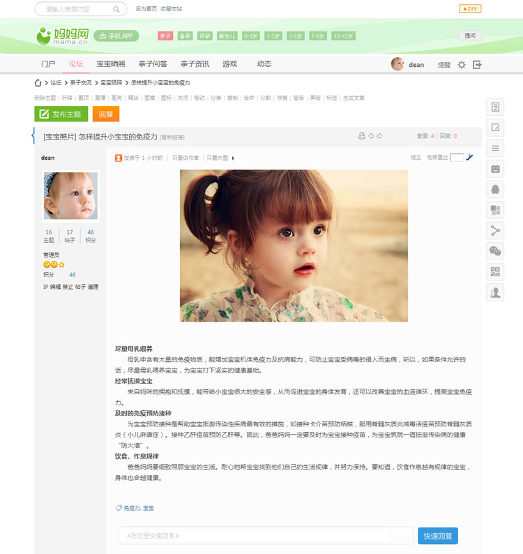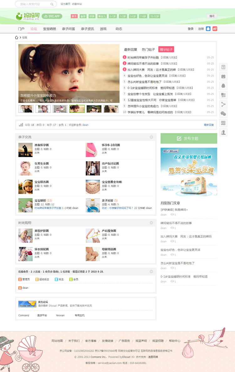 1.模板名称:"迪恩baby!亲子风",版本支持:discuzx3.0版本,discuzx3.1版本,discuzx3.2版本,包括①网站首页②论坛门户③论坛版块④论坛列表页(亲子宝宝照)⑤论坛内容页⑥资讯列表/内容页等(可以添加N个),让您网站更佳汇聚人气,助您网站成功!