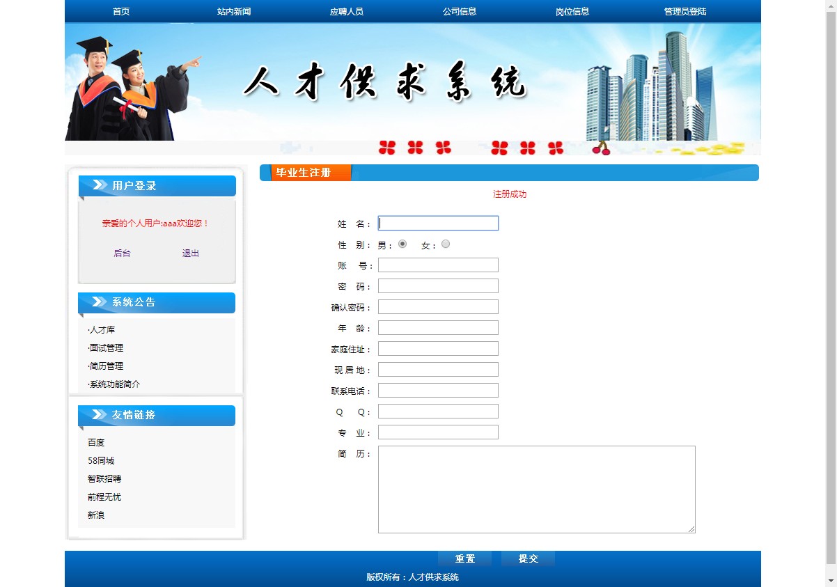 在线人才供求系统,有个人和企业两种会员权限,管理员有单独后台管理。