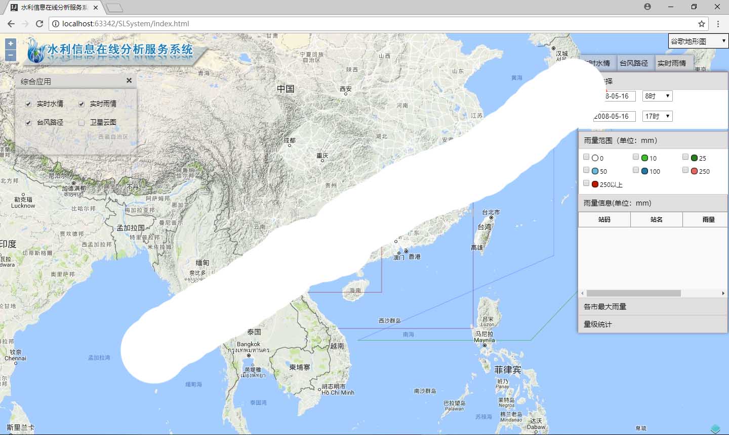 公共地图加载:本系统的地图选用Google在线地图,默认加载Google地形图为底 图,实现Google地图各类型图层的切换功能。以Google地图为底图,上层动态叠加显示各 类实时水情、雨情数据等。