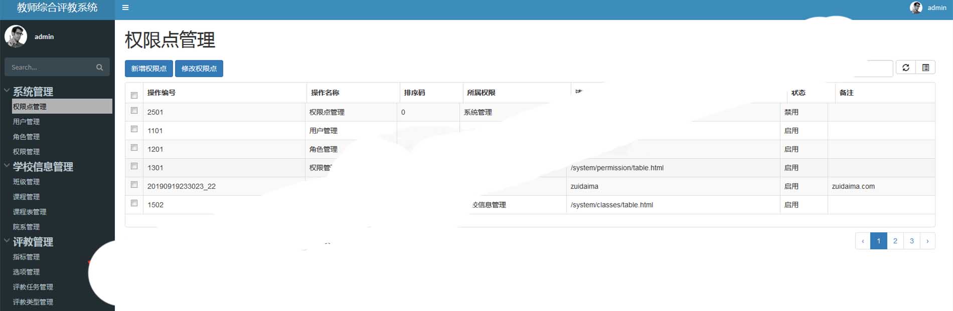 运行环境jdk8+tomcat7+mysql5.6以上+IntelliJ IDEA+maven技术springboot+mybatis+bootstrap+jquery模仿高校教师评教系统,主要功能分为系统管理(用户管理,角色管理,菜单管理),基础功能模块(院系,班级,指标,课程,授课),评教管理(评教,查看评教结果,统计分析(报表未完成)),本项目使用了前后端分离