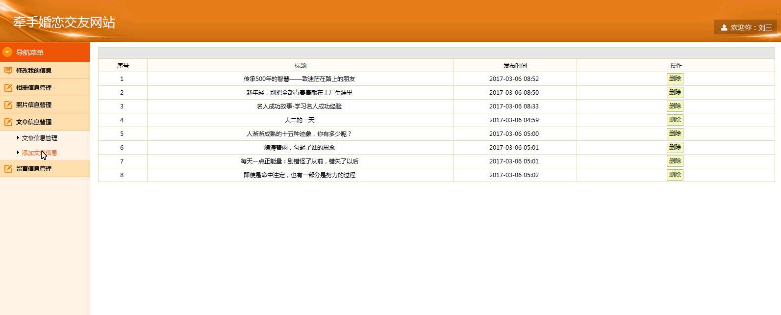 本婚恋交友网站实现了网上婚恋交友和对婚恋交友信息管理。网站分为前台和后台两部分,用户在前台可注册成为网站用户,注册用户登录系统后,除了像游客那样浏览网站信息,还可以在线添加好友、评论照片和发起留言,进入个人中心后可以对自己的个人信息进行管理,也可以对自己的相册信息、照片信息、文章信息以及留言信息进行管理,管理员登录系统后可以对自己的登录信息、注册用户信息、系统公告信息、友情链接信息、相册信息、照片信息以及文章信息进行管理。