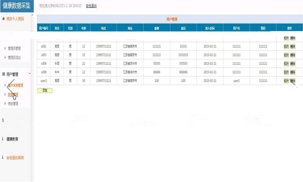 4.用户管理:基本信息管理、数据管理、病史管理