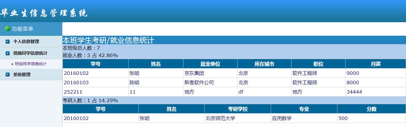②班级同学信息统计:对班级的就业、考研的总人数、百分比以及具体的就业和考研的信息进行查询统计。