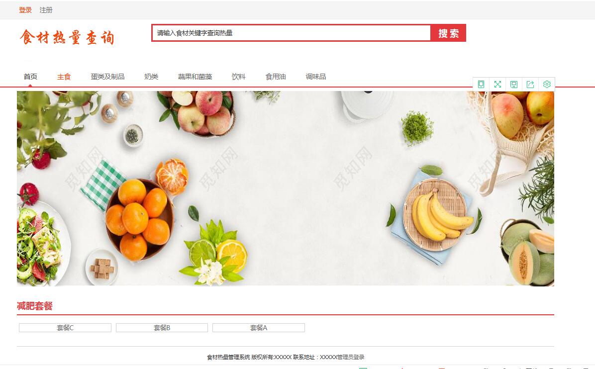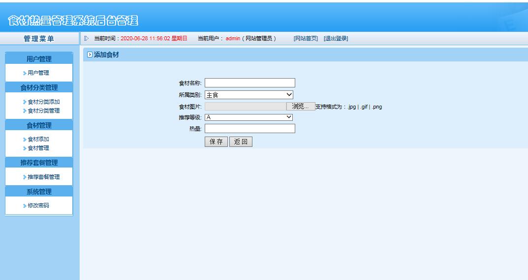 用户可根据个人的需求来查询食材的热量(查询方式:输入查询,按不同食材类型查询)。管理员可设置食材热量信息和食材种类,并进行食材热量信息和食材种类的查询,修改,添加。